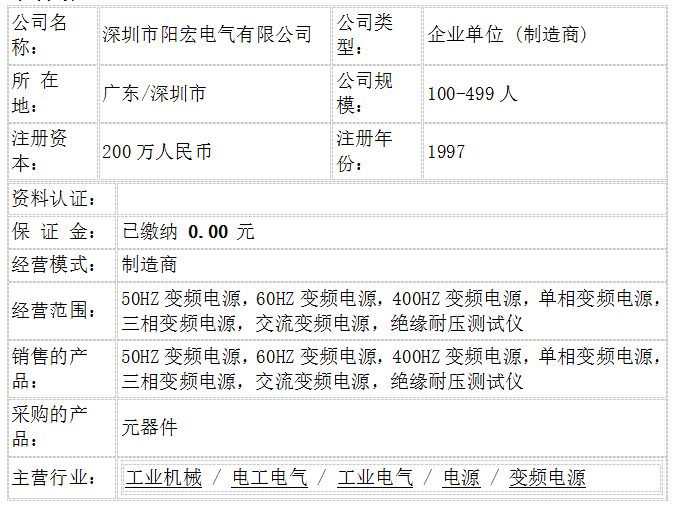 模擬式晶體管式可編程式單相大功率三相大功率變頻電源是陽宏電源股份有限公司的核心產品。深圳市陽宏電氣有限公司隸屬臺灣陽宏電源股份有限公司,是一家集變頻電源開發、研制、生產、銷售和服務為一體的高新技術企業。其大陸工廠:【深圳市陽宏電氣有限公司】是臺灣陽宏電源股份有限公司在中國大陸一家分公司,地址:深圳市寶安區觀瀾街道觀瀾高新科技園區。 ??臺灣陽宏電源股份有限公司創建于1995年,目前除了臺北公司以外,在中國的廣東深圳設有分公司,工廠擁有許多的先進設備。具有年產各種電子儀器電源設備20000臺以上,工廠有嚴格的生產能力,強大的開發技術管理制度,可以接受新高技術產品的開發與研制。 ??現今世界,工廠用電質量已成為制約經濟高速發展和環境保護的核心因素,陽宏電氣一直致力于改善客戶在電力領域的績效和日常生活水平。作為在模擬世界各國電網環境領域的世界企業,陽宏電氣集團業務包括5大市場:變頻電源、絕緣耐壓測試儀和交流穩壓電源,電子變壓器以及直流電源等領域提供產品和服務。 ??憑借其獨特的產品系列,陽宏電氣開發了全系列的模擬式、晶體管式和可編程式的解決方案,使供電環境更精準,更安全,節能增效作用更加明顯,依靠全球超過數百家優質經銷商的參與,陽宏電氣將幫助人類最充分地享用世界各國電網。 ?? ??對客戶業績的貢獻 ??陽宏電氣在創新、質量和效率方面有著宏偉的戰略,同時積極開展合作和并購業務以拓寬自己的產業陣容。陽宏電氣在使電力應用更為安全和便捷的同時,以更有效的解決方案系列服務于市場需求,并開發定制增值服務。 ??優秀的員工是這一戰略的根基,他們構成了一支熱衷開拓、銳意進取的團隊。我們還提供所有級別的在崗培訓,能夠根據技術和客戶需求的變化來拓展和調整員工的技能。 ??目前,陽宏電氣在100多個國家開展業務,我們的產品和服務遍布世界各地,符合各國的標準和規范。